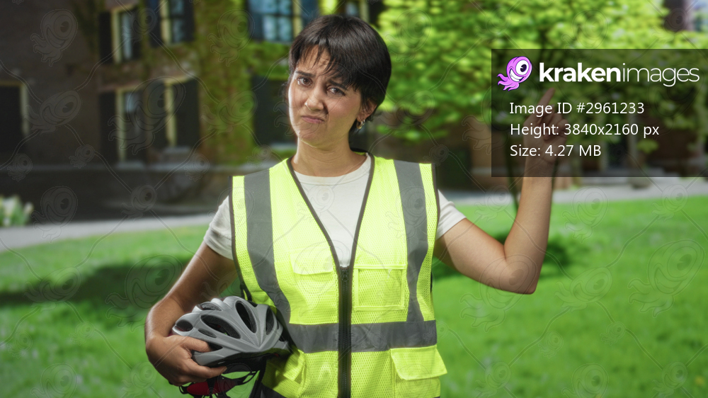 Woman with short hair in yellow safety vest holding bike helmet points index finger toward building with a skeptical grimace; disapproval.