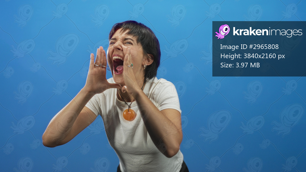 Woman with short hair and orange pendant shouting with hands cupped around mouth wearing white tee in blue studio; anger protest.