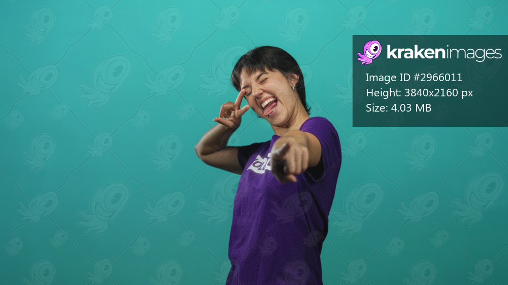 Woman with short hair pointing fingers at camera, hands extended, smiling in purple tshirt in studio; playful energy.