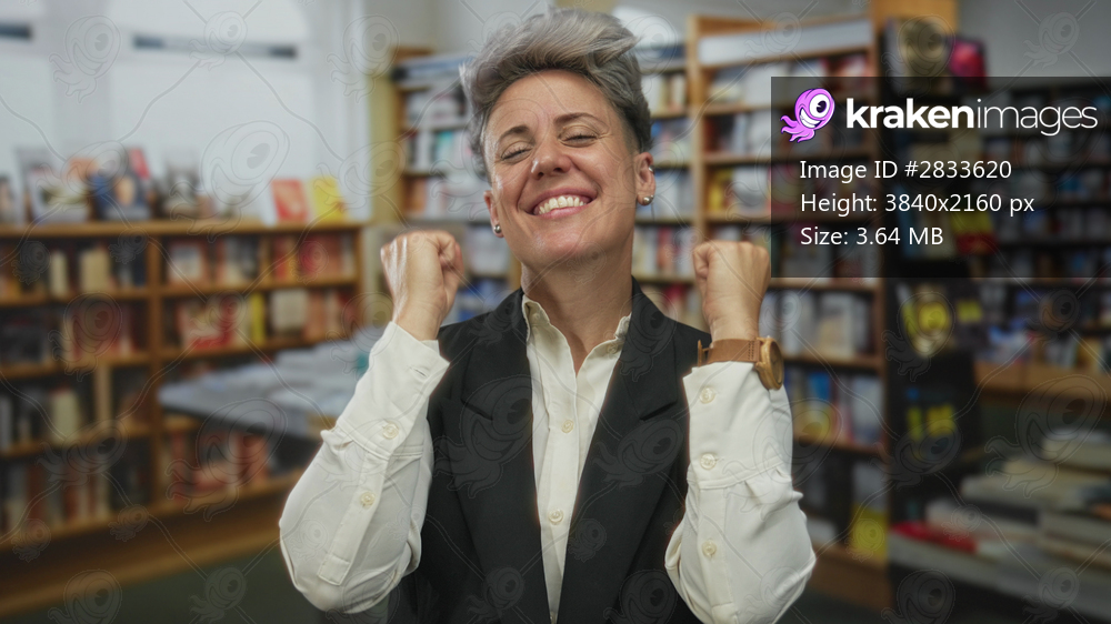 Woman with short hair raising clenched fists in library surrounded by shelves of books; celebration.