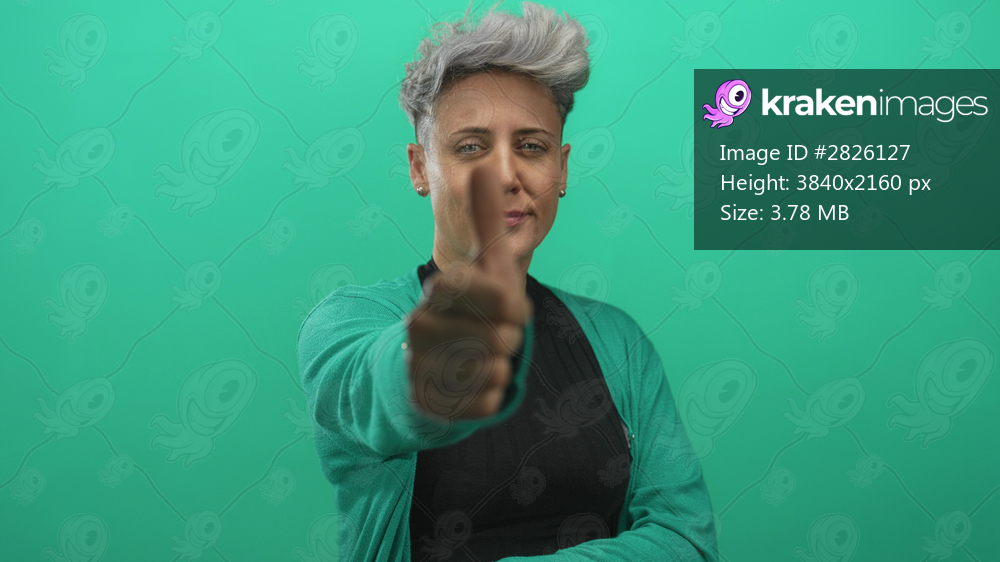 Woman with short hair shows thumbs up gesture in green studio setting, wearing teal cardigan and black top; confidence.