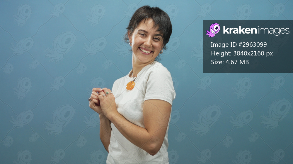 Woman short hair smiling with clasped hands at chest, wearing orange pendant necklace and rings in studio; joyful warmth.