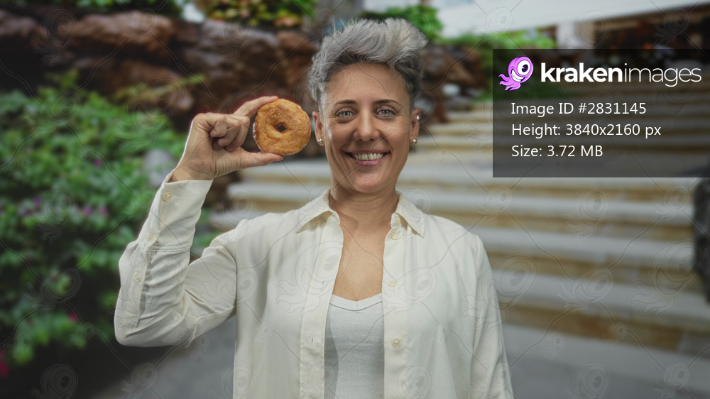 Woman with short hair smiling while holding a glazed donut near her face in front of building; joy satisfaction.