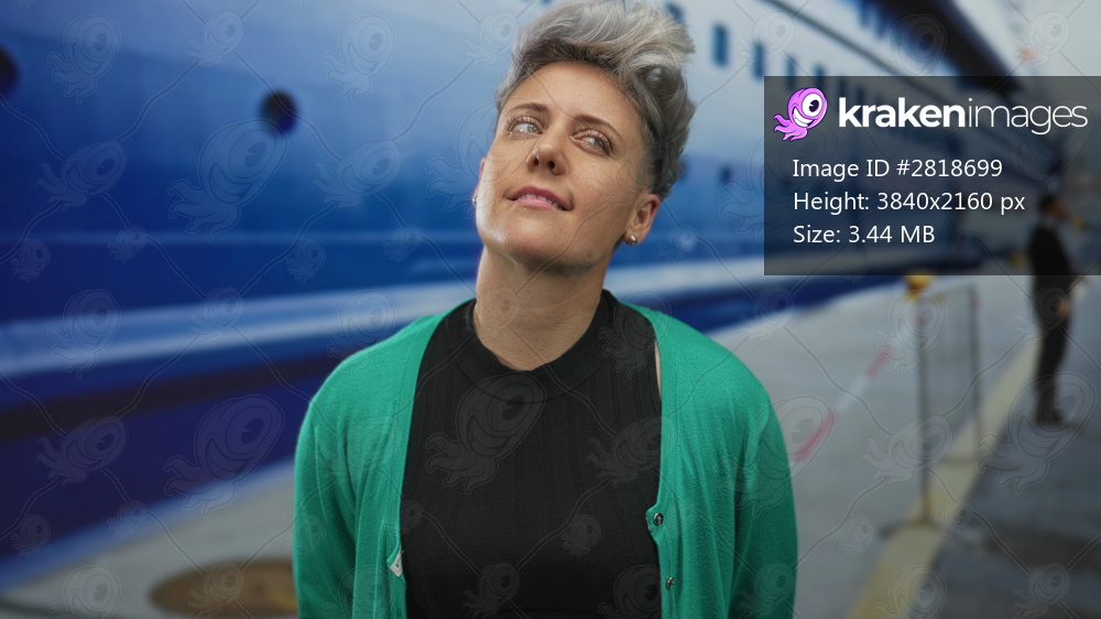 Woman with short hair tilts head beside a large blue boat at a busy port pier while gazing upward; serenity reflection contemplation wonder.