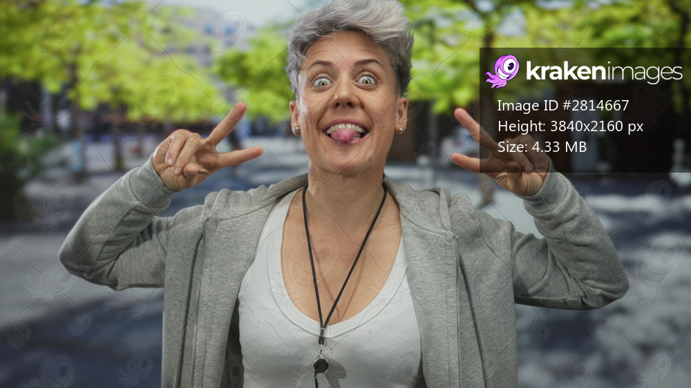 Woman with short hair wearing a gray hoodie smiles and shows thumbs up gesture on street lined with trees; optimism.