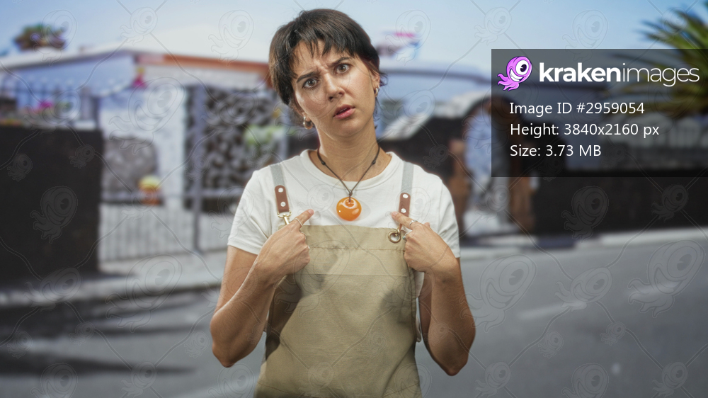 Woman with short hair wearing an apron and white tshirt points finger to chest, showing orange pendant and rings, posed on a street by an arched gate; confusion. - Kraken Images