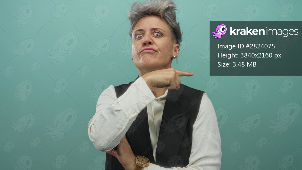 Woman with short hair wearing black vest and white shirt making throat cutting gesture with hand in studio; anger threat danger.