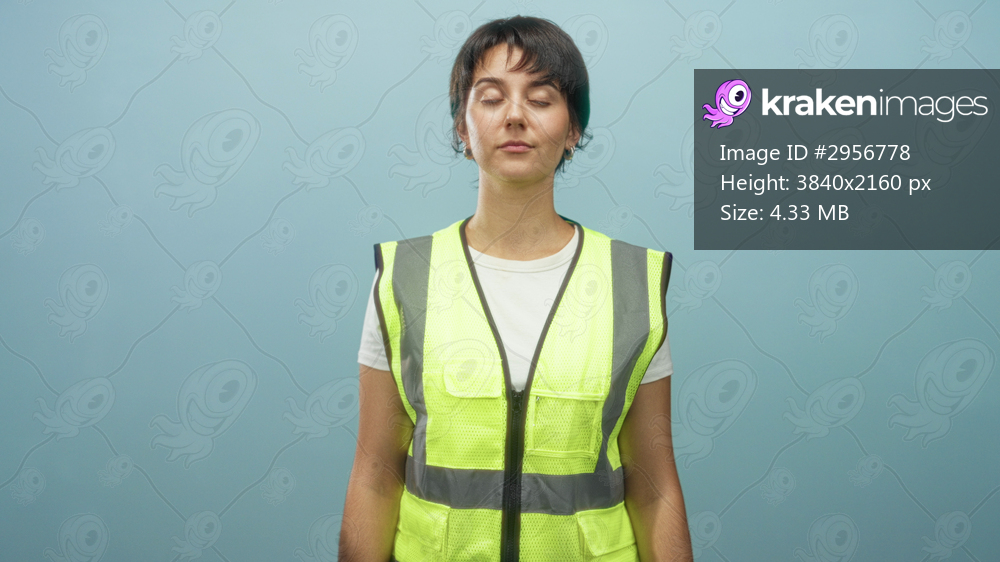Woman with short hair wearing neon fluorescent safety vest and white tshirt, standing eyes closed in studio facing camera; calm reflection.
