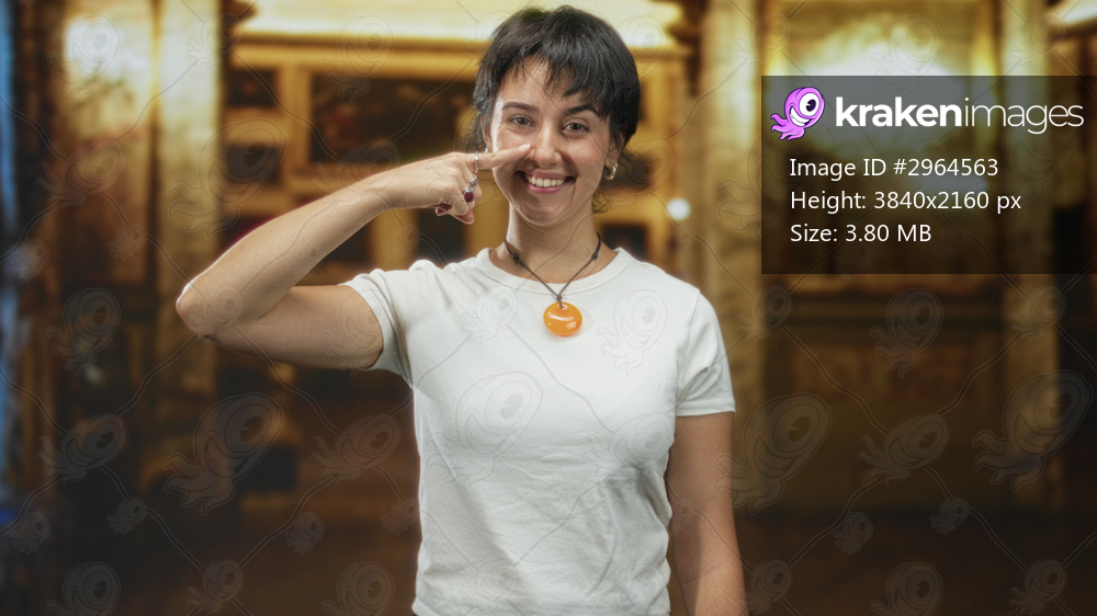 Woman with short hair wearing orange pendant and white tshirt points finger to cheek in building with chandeliers and paintings; playful confidence.