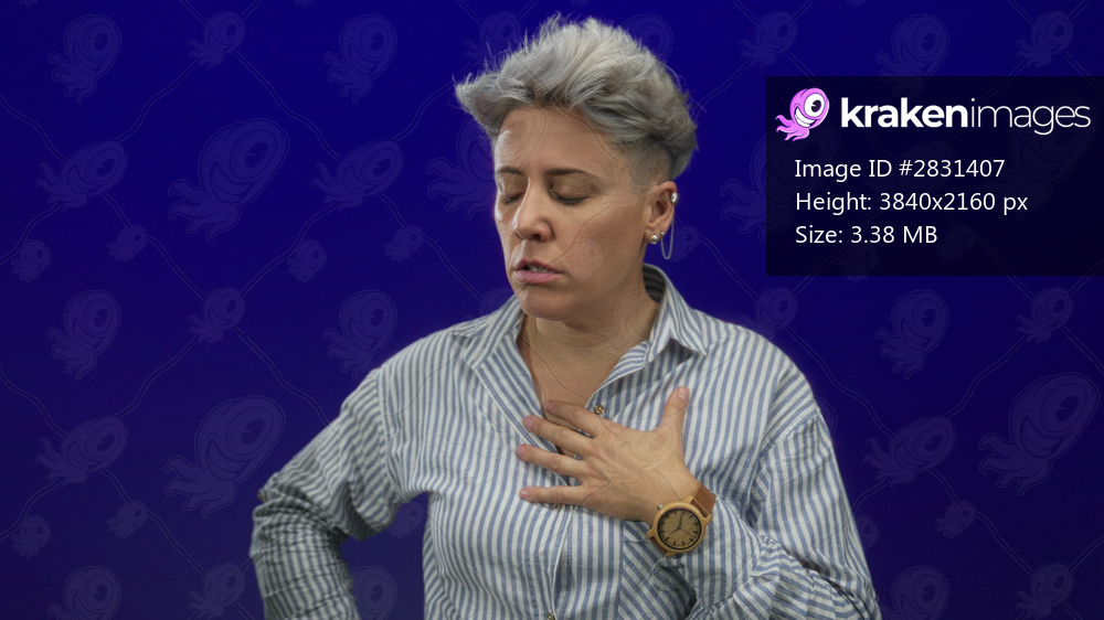 Woman with short hair wearing striped shirt clutch chest and closes eyes in front of blue studio wall; anxiety.