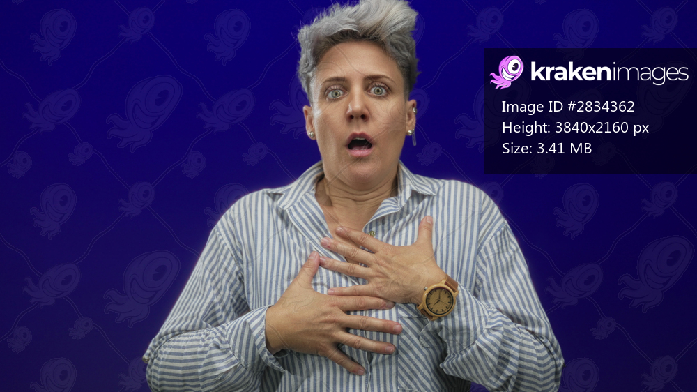 Woman with short hair wearing striped shirt clutch chest and closes eyes in front of blue studio wall; anxiety.