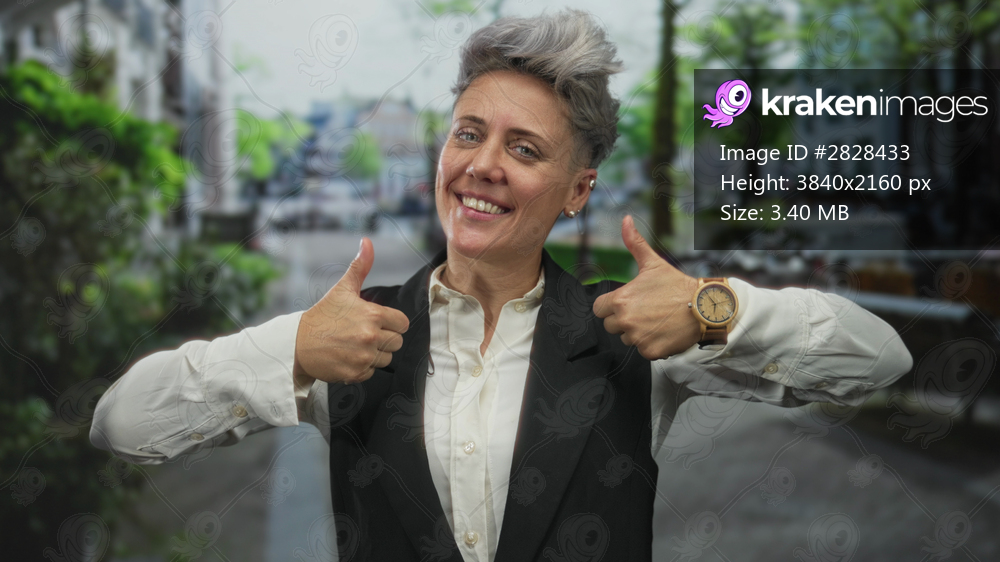 Woman with short hair wearing white shirt and black vest giving double thumbs up gesture on a city street with buildings and potted plants; optimism hope confidence encouragement. - Kraken Images
