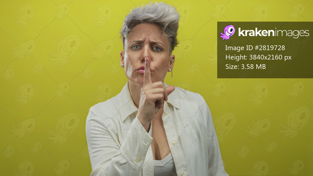 Woman with short hair wearing white shirt finger to lips for silence in yellow studio with stern expression; calm hush.