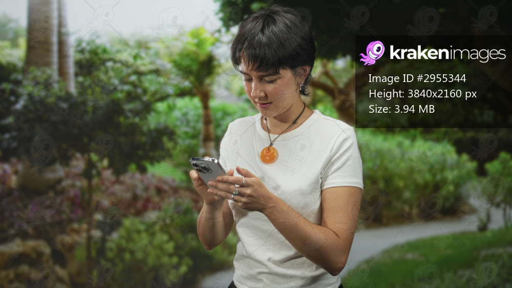 Woman short hair wearing white t shirt and orange pendant holding smartphone and tapping screen with fingers on a forest pathway; serenity.