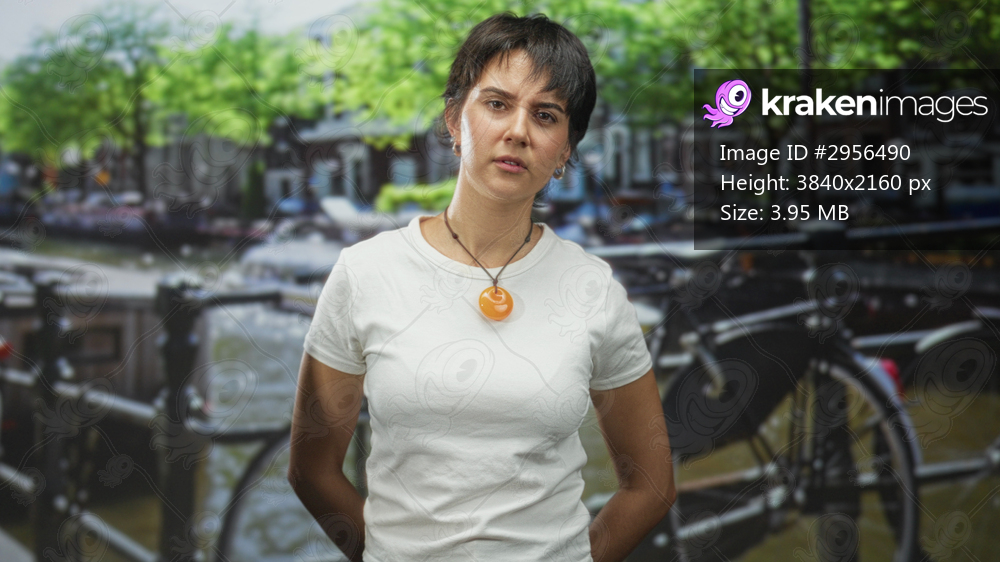 Woman with short hair wearing white tshirt and orange pendant necklace, hands behind back leaning forward toward camera in studio; concern introspection. - Kraken Images