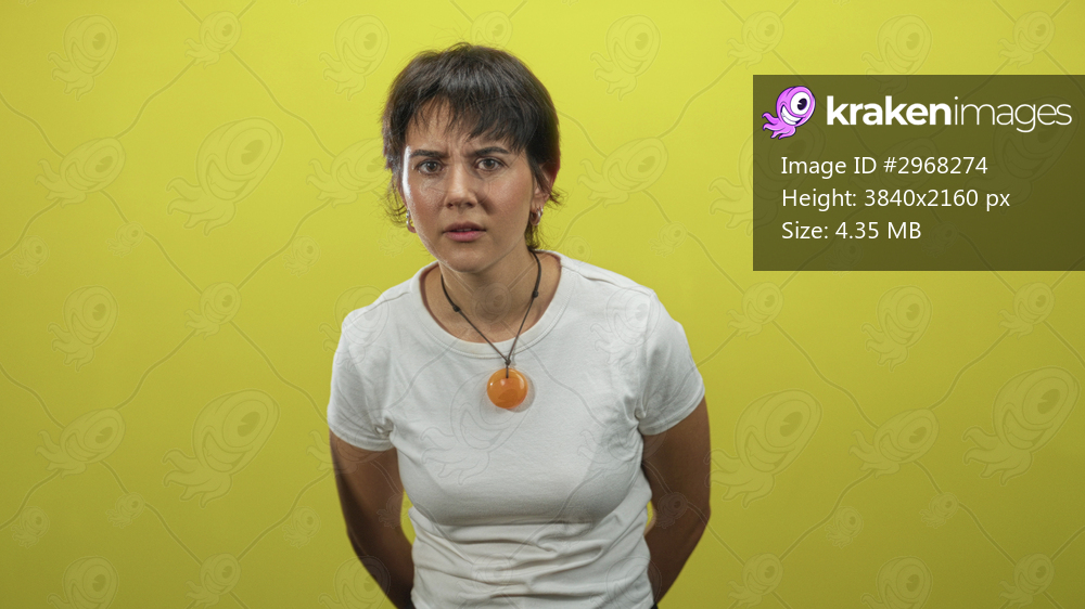 Woman with short hair wearing white tshirt and orange pendant necklace leaning forward hands behind back in studio; confusion introspection.
