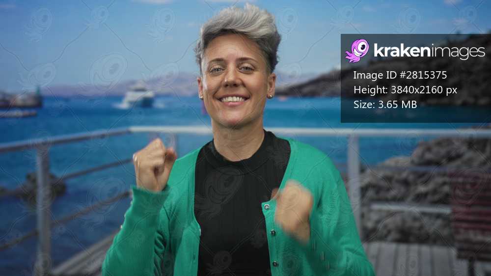 Woman with short silver hair clenches fists and smiles in a studio with a boat backdrop and seaside view; excitement.