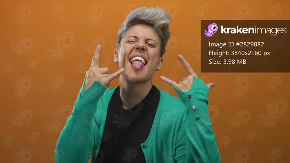 Woman with short silver hair displays rock horns gesture and tongue out in orange studio setting; playfulness.