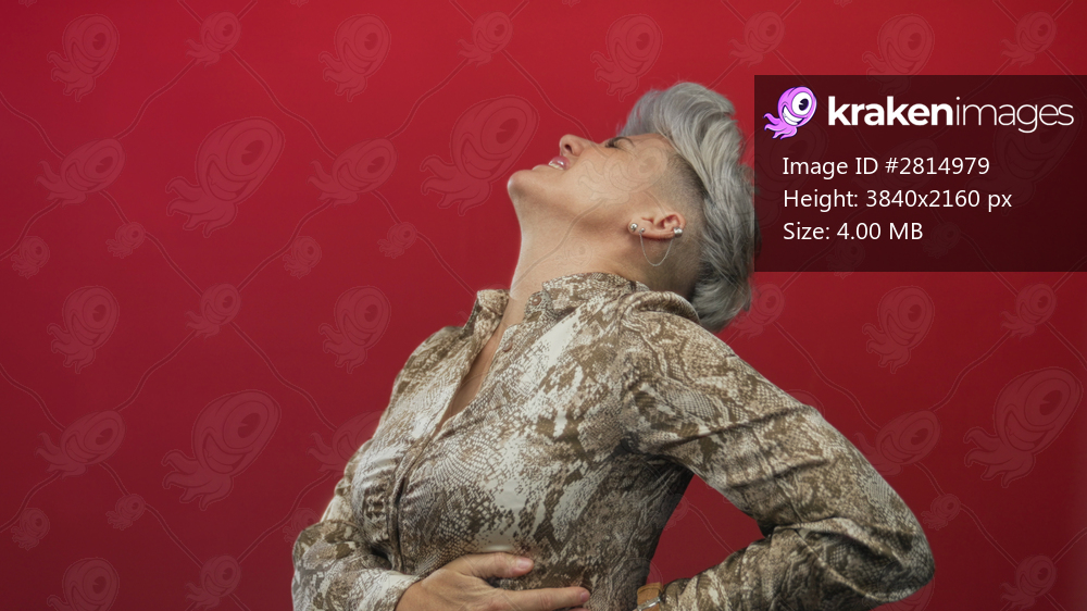 Woman with short silver hair holds lower back in red studio wearing snake print blouse; backache pain.