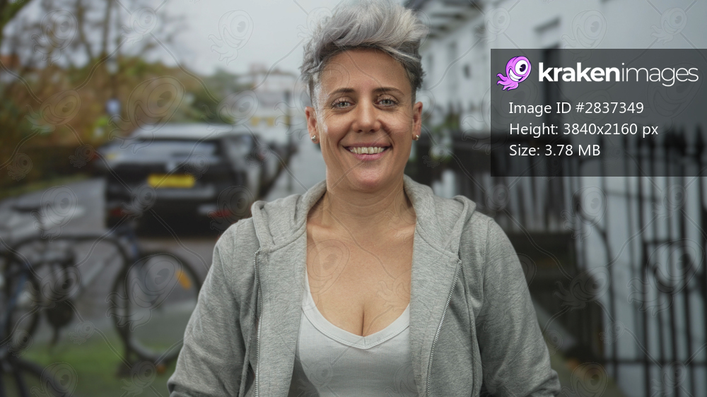 Woman with short silver hair in grey hoodie smiling with closed eyes on a city street; happiness.