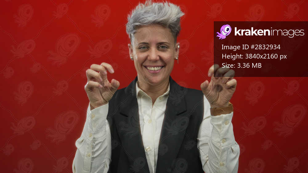 Woman with short silver hair smiling hands show claw gesture studio; playfulness joy exuberance fun.
