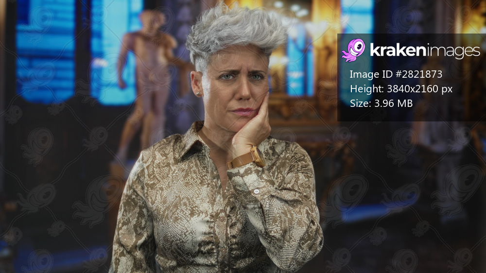 Woman with short silver hair wearing snake print shirt holds her cheek with hand in museum hall; discomfort.