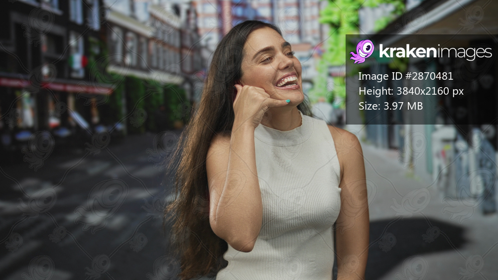 Woman shoulder and arm showing call gesture to face in urban street scene with buildings behind; joy.