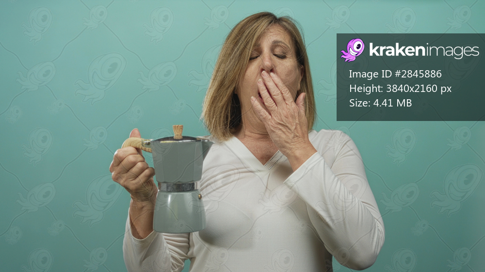 Woman with shoulder length hair holds green stovetop coffee maker while yawning in studio against turquoise wall; morning fatigue.