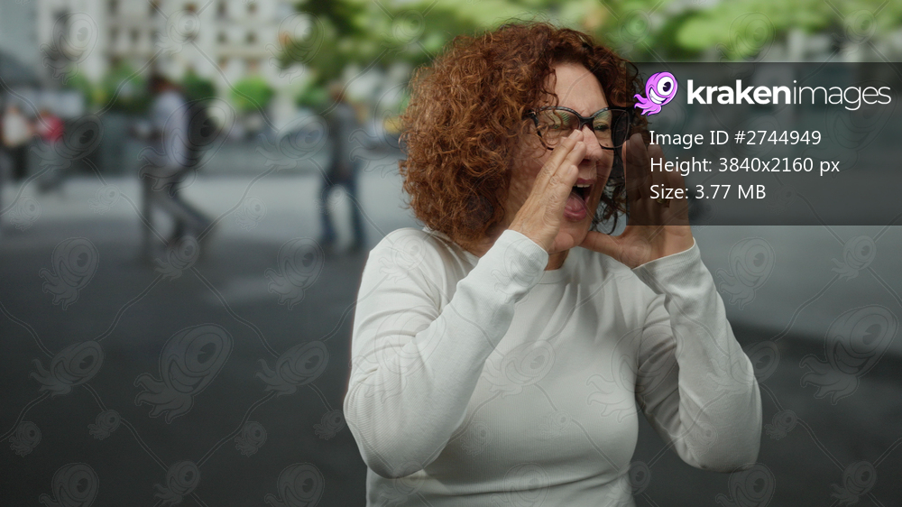 Woman shouting energetically on a bustling city street with a blurred backdrop of passersby embodying urban vibrancy and middle-aged confidence in an outdoor environment. - Kraken Images