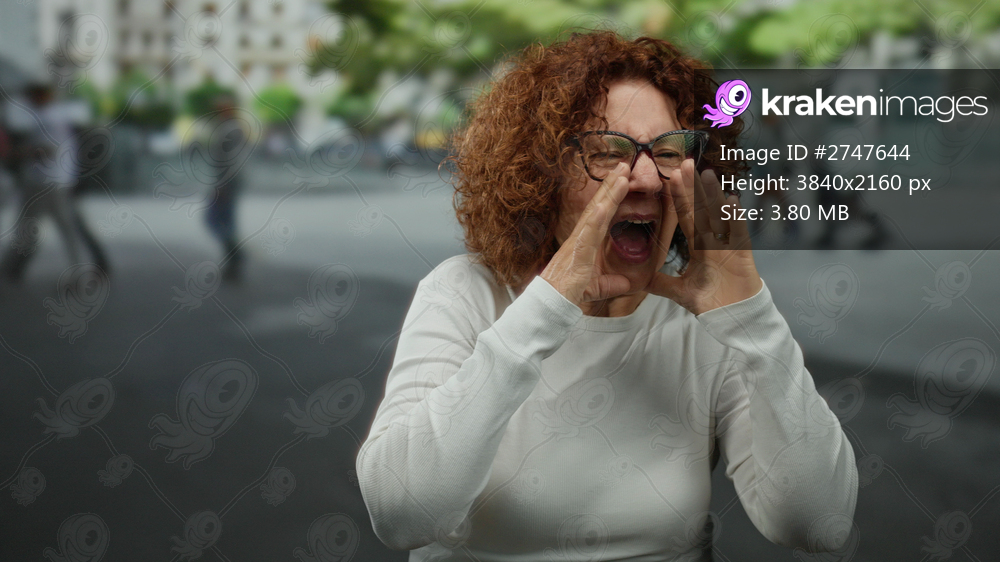 Woman shouting energetically on a bustling city street with a blurred backdrop of passersby embodying urban vibrancy and middle-aged confidence in an outdoor environment. - Kraken Images