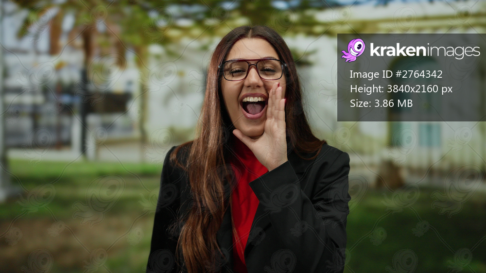 Woman shouting with excitement in a sunny park setting, wearing glasses and a red jacket, showcasing joyful expression and youthful energy.