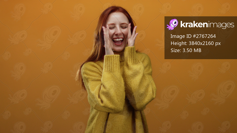 Woman shouting with eyes closed in front of an orange background wearing a cozy sweater, conveying excitement or surprise, redhead featuring joy and emotion, emphasizing female presence. - Kraken Images