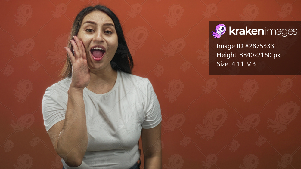 Woman shouting with hand cupped to mouth and open lips in orange studio wearing white t shirt; excitement.
