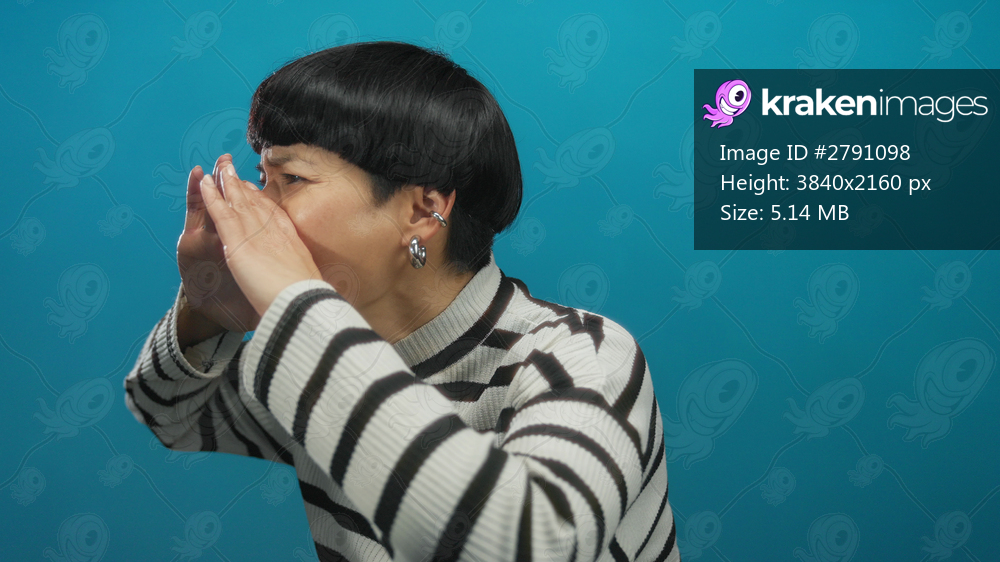 Woman shouting in different directions over an isolated blue background, wearing a striped sweater, embodying expressions of stress or communication with vibrant energy. - Kraken Images