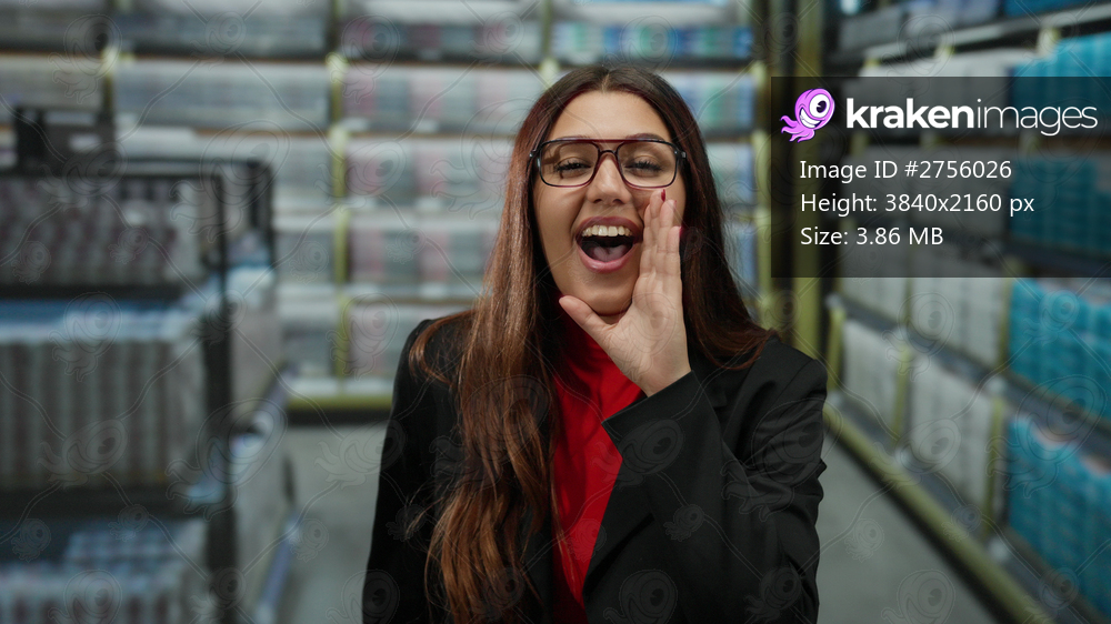 Woman shouting indoors with excitement while standing in a large warehouse wearing glasses and a red outfit