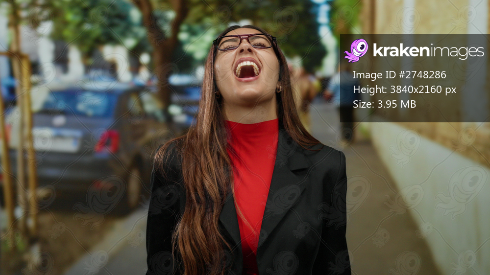 Woman shouting joyfully in street with trees and cars in background, wearing glasses and red outfit outdoors on a sunny day.