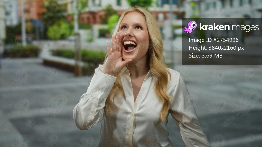 Woman shouting joyfully on a bustling city street, wearing a white shirt with blonde hair flowing, capturing a lively and vibrant outdoor urban scene.