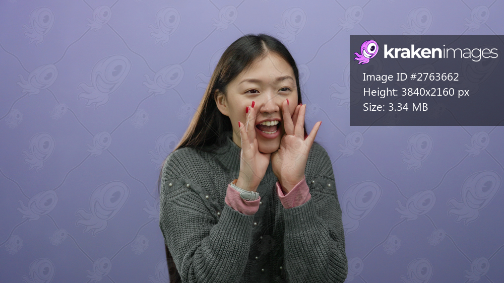 Woman shouting over isolated purple background, wearing a gray sweater, expressing excitement with long black hair, vibrant red nails, asian adult, female, attractive. - Kraken Images