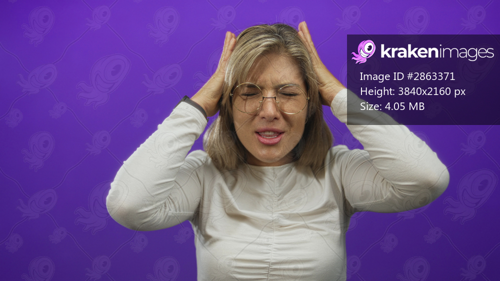 Woman shouting with raised hands in purple studio wearing white shirt and round glasses; frustration exhaustion stress.