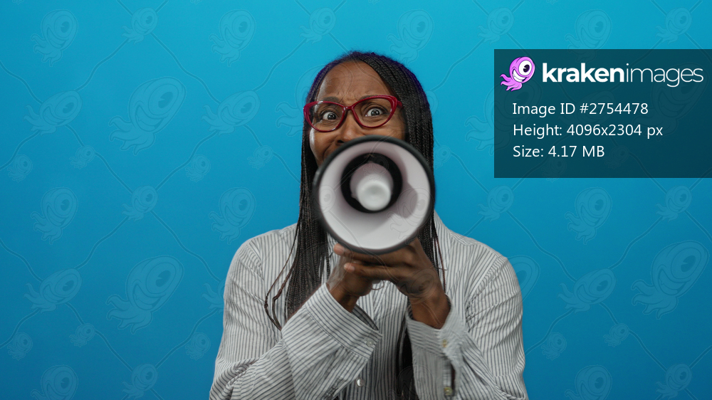 Woman shouting through megaphone against blue background wearing glasses and shirt with braids showing excitement and strength conveying communication and empowerment. - Kraken Images