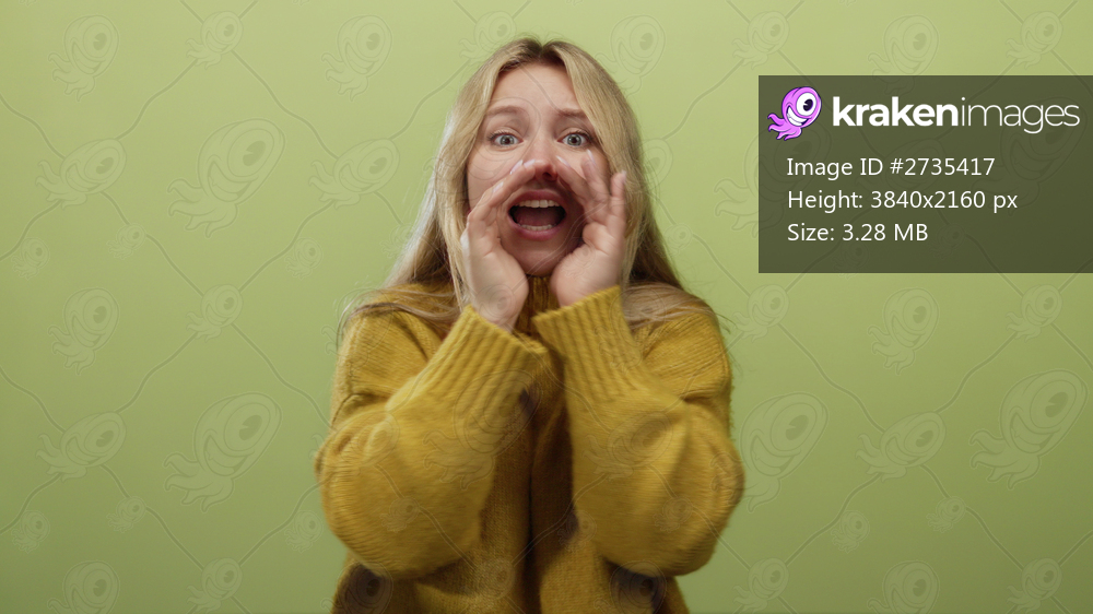 Woman shouting wearing yellow sweater against green background with expressive gestures highlighting strong emotions and isolated setting for concept of joyful communication. - Kraken Images