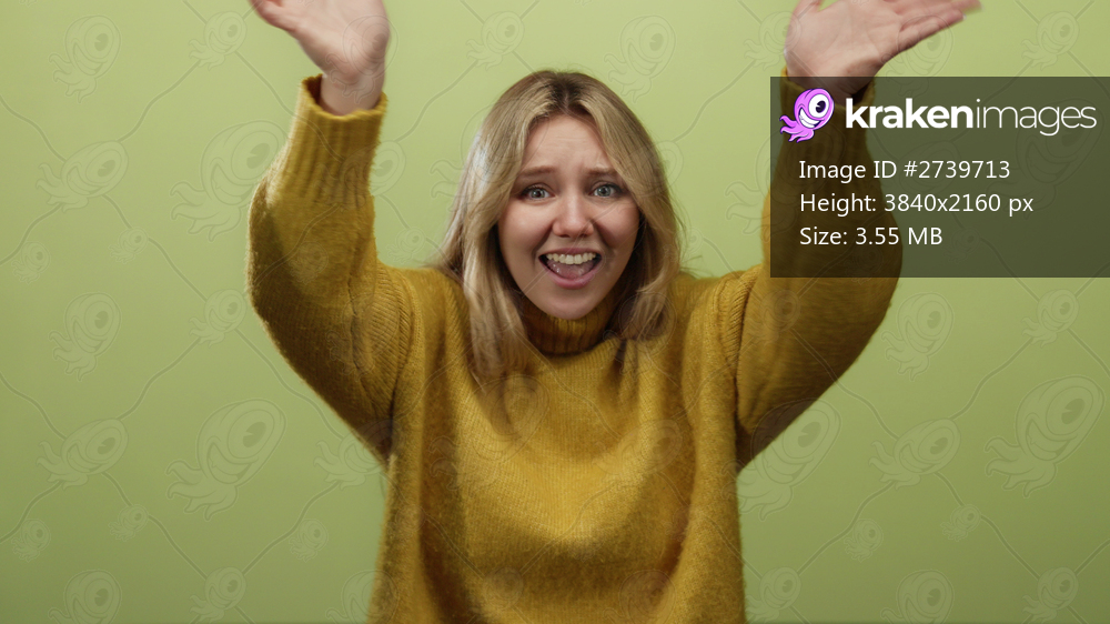 Woman shouting wearing yellow sweater against green background with expressive gestures highlighting strong emotions and isolated setting for concept of joyful communication. - Kraken Images