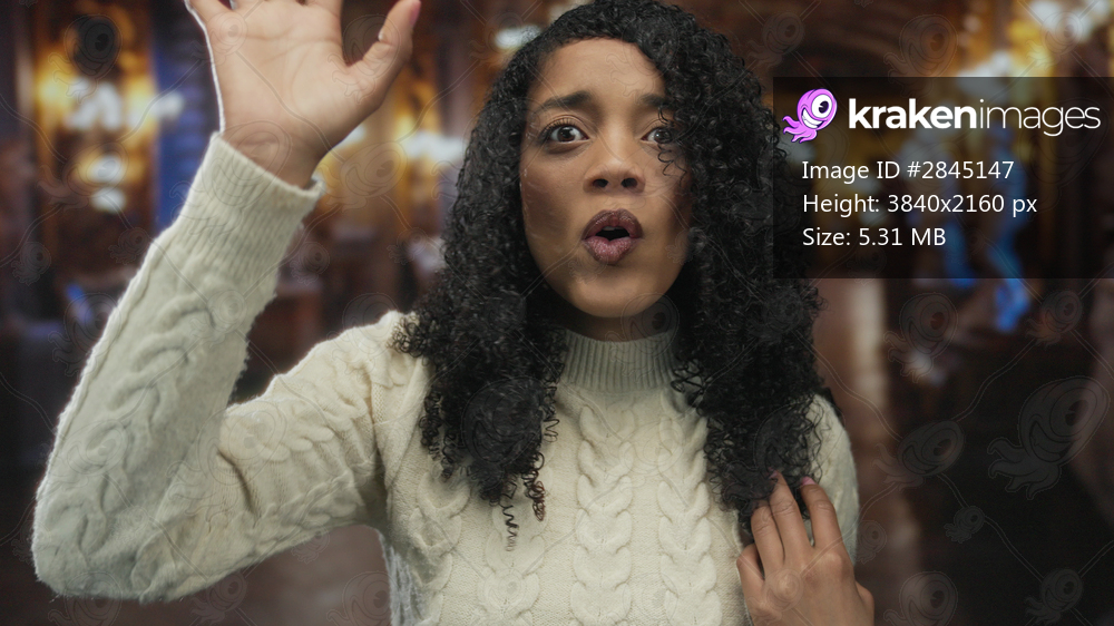 Woman shouts with hands cupped around mouth beside white marble sculpture in museum building; excitement.