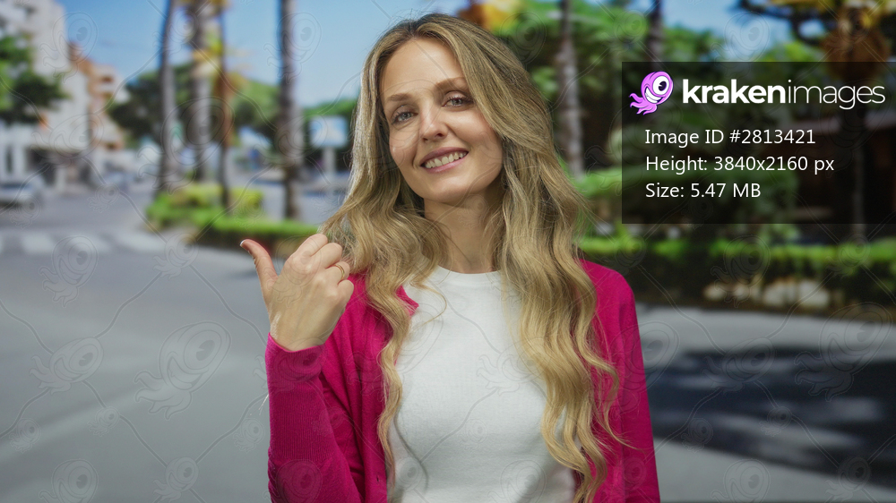 Woman showcases her hand in a pointing motion along a busy street with a young blonde model outdoors smiling in a casual gesture.