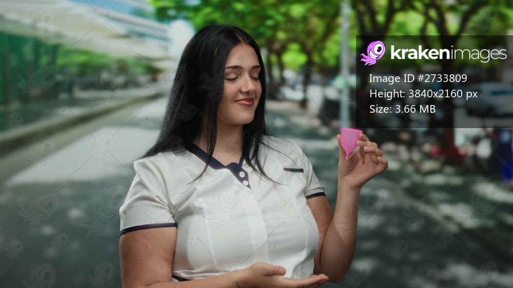 Woman showcasing menstrual cup on city street with confident smile, promoting eco-friendly lifestyle and well-being outdoors.
