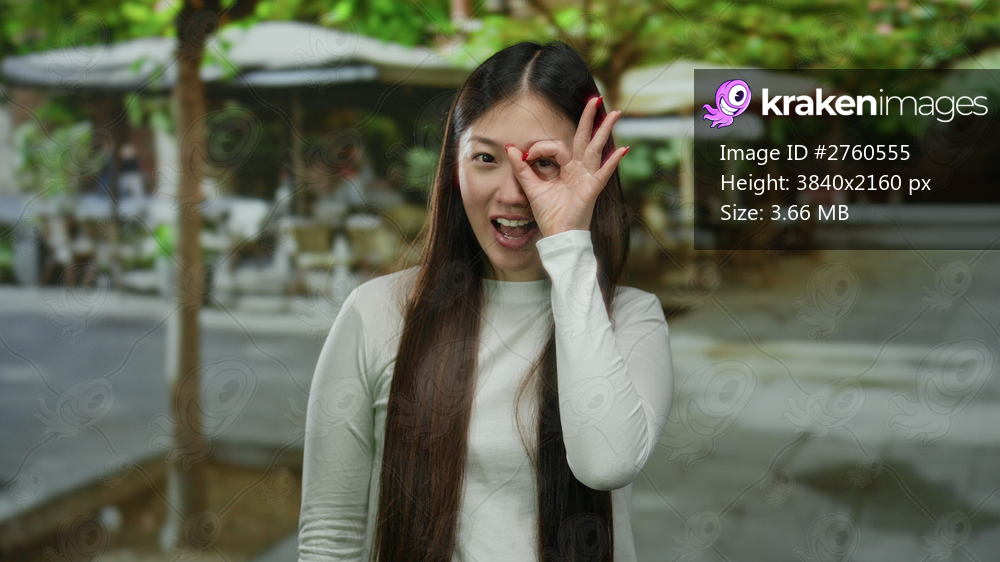 Woman showcasing playful eye gesture in urban terrace with outdoor restaurant in background, surrounded by city ambiance, exuding charm and beauty with serene smile. - Kraken Images