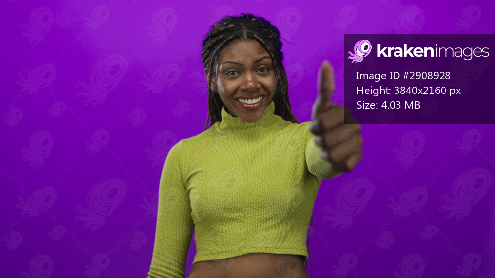 Woman showing a thumbs up gesture with extended hand and visible midriff in purple studio; confidence uplift.