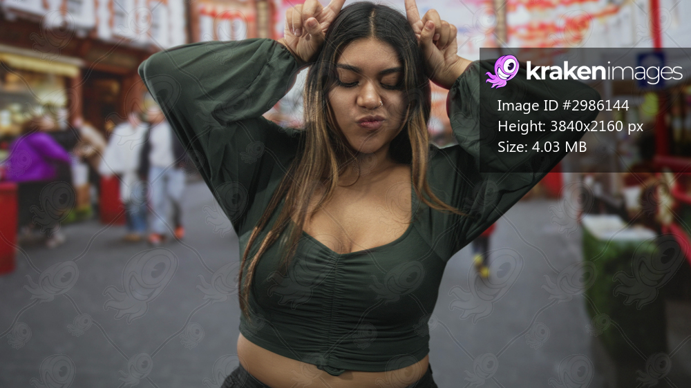 Woman showing cleavage in green top with hands raised making horns gesture in street market filled with stalls and lanterns; playful confidence.