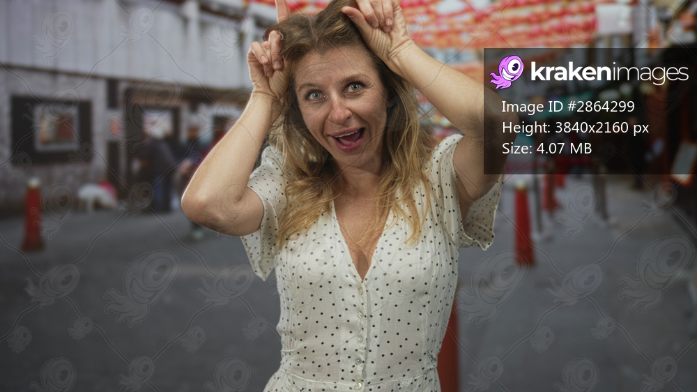 Woman showing cleavage makes horns with hands on street market, smiling and turning head; joy playful spontaneity.