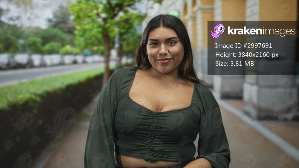 Woman showing cleavage smiling on a street colonnade in green crop top and casual pose; confidence empowerment.